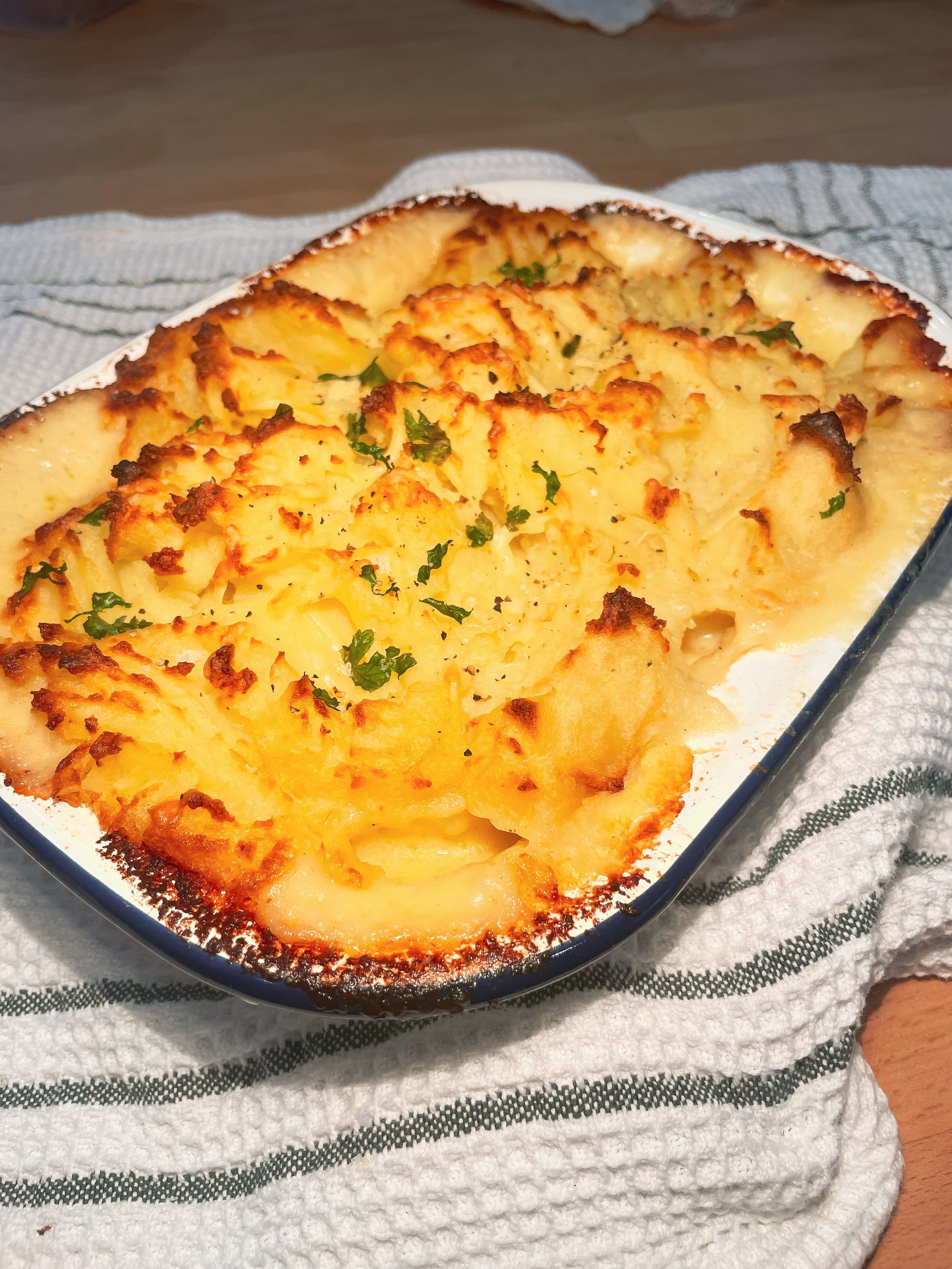 I am often asked, ‘Why does the potato top seem to melt into the meat part of a Shephard’s pie? A tip I can share with you for the perfect separation of meat and mash is to let the meat filling cool just a little before adding the mash on top. This method stops the mash from running into the hot gravy of the filling.